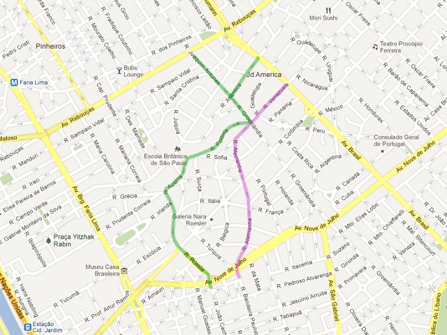 Na subida (em lilás no mapa), chegando pela Bandeira Paulista, a rota é: Alemanha, Inglaterra, Venezuela. A partir daí, segue-se para Pinheiros ou Perdizes pela Brasil ou para a Paulista via Bela Cintra.