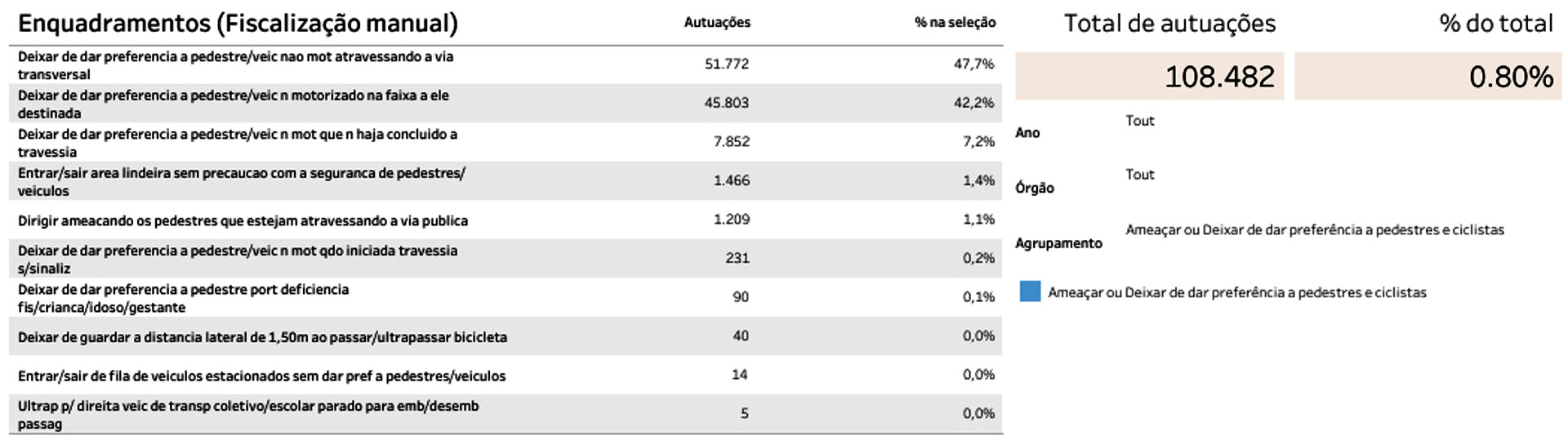 No portal do estudo, os dados de fiscalização estão organizados num painel interativo onde o usuário pode selecionar as informações que lhe interessam e, eventualmente, cotejá-las com aquilo que observa na realidade concreta das ruas. Verá que o número de autuações manuais por ultrapassar um sinal vermelho é 15 vezes maior que o número de autuações por desrespeito à travessia de pedestres (o segundo enquadramento da tabela acima). Agora tente imaginar (ou de fato observar) um cruzamento real da sua cidade. Parece razoável que para cada 15 motoristas que passam pelo sinal vermelho existe apenas um motorista que desrespeita pedestres atravessando pela faixa? Qualquer pedestre sabe como é frequente o desrespeito à travessia, mas parece que os agentes de trânsito de São Paulo não estão muito preocupados com isso.