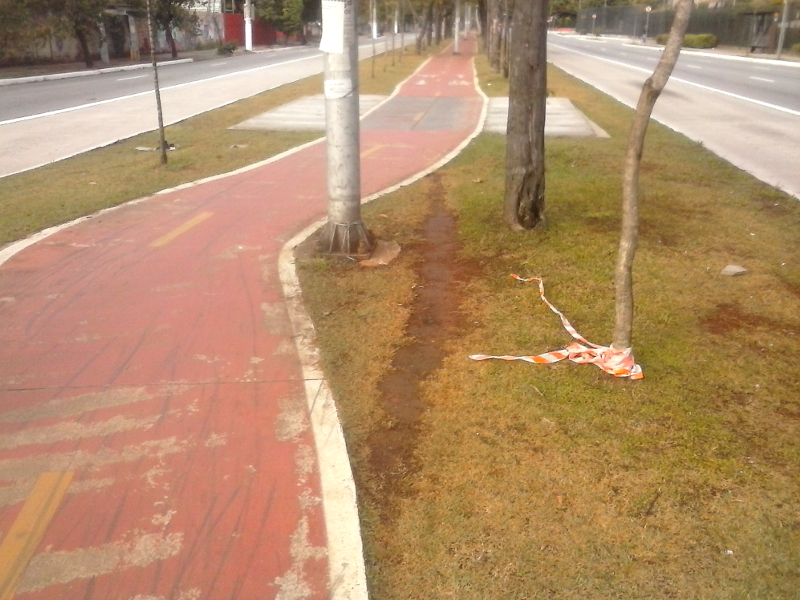 A partir de milhares de decisões individuais, cada um com seus critérios, emerge um comportamento coletivo, que pode deixar marcas físicas na cidade. A foto mostra um caso em que o caminho praticado de fato por muitos ciclistas não coincide com o caminho proposto pelos planejadores.