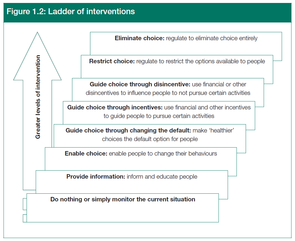 Um documento publicado em 2011 pelo Departamento de Transportes da Inglaterra, com o objetivo de orientar o corte nas emissões de carbono, utiliza um modelo interessante para ajudar a planejar o processo de mudança: a Escada das Intervenções. O conceito foi trazido da área da saúde pública, onde pode ser usado, por exemplo, para abordar melhorias nos hábitos alimentares de uma sociedade.